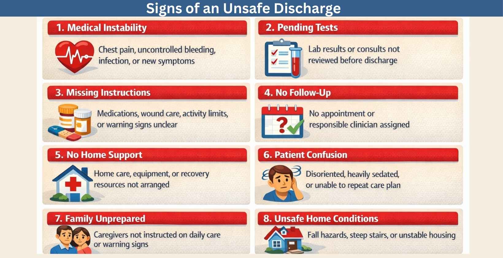 - Unsafe discharge can lead to complications, medication mistakes, emergency room visits, or preventable readmission.